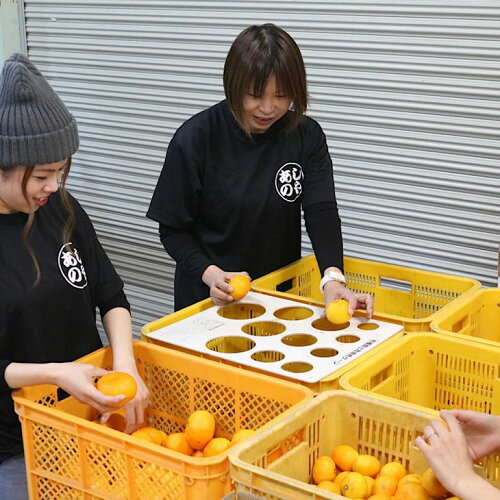 収穫してきたみかんを、選別機を使わずに1つずつ手で選別した上で、箱に丁寧に詰めています!皆様においしく頂けるよう従業員全員で取り組んでいます。