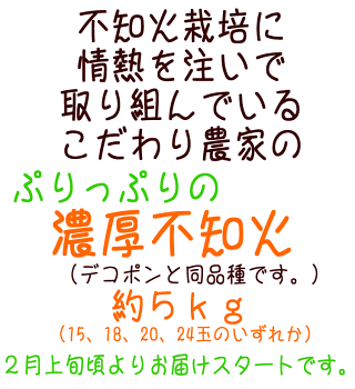 冬から春にかけて旬のお子様からご年配の方まで人気のみかん『不知火』をぜひご賞味ください。