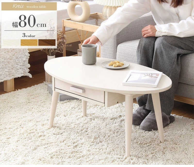 引出し付きテーブル ローテーブル Kreis 引き出し テーブル 在宅 テレワーク 机 収納 センターテーブル リビングテーブル 北欧 小さめ 80幅 楕円 木製 天然木 おしゃれ コンパクト 一人暮らし ウォールナット ブラウン ナチュラル ホワイト