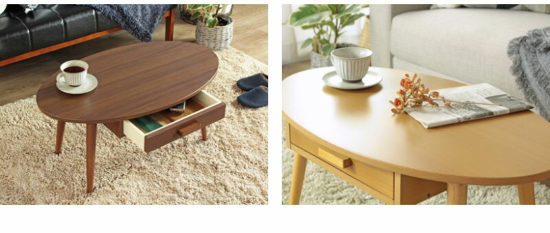 丸くて可愛い卵型の楕円形フォルムに、ぬくもりのある木の質感が空間を優しく包み込む、引き出し付きローテーブル・クライス。