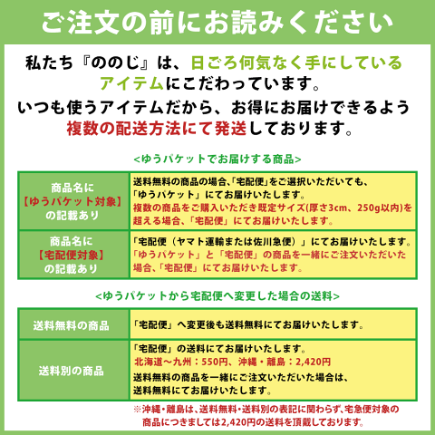<ゆうパケットでお届けする商品> ■商品名に【ゆうパケット対象】の記載あり送料無料の商品の場合、「宅配便」をご選択いただいても、「ゆうパケット」にてお届けいたします。