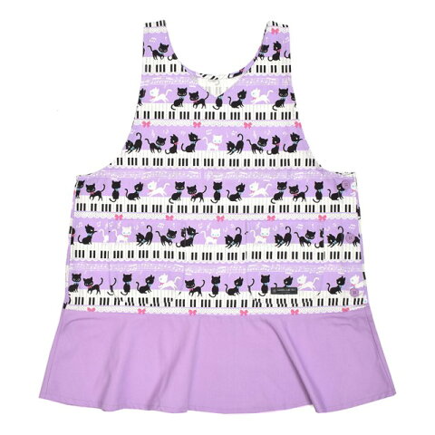 商品名保育士エプロン ピアノの上で踊る黒猫ワルツ(ラベンダー)商品の特長1.すっぽりかぶるだけのショート丈エプロンお子様に引っ張られても、肩ひもがずり落ちる心配のないかぶりタイプ。